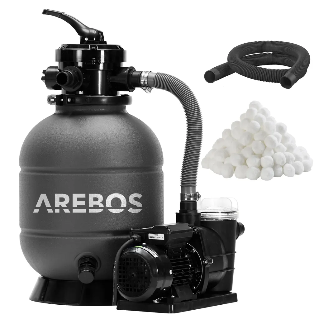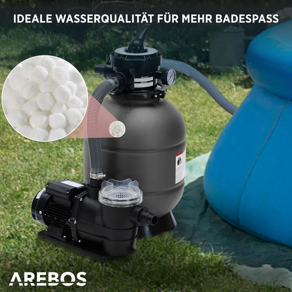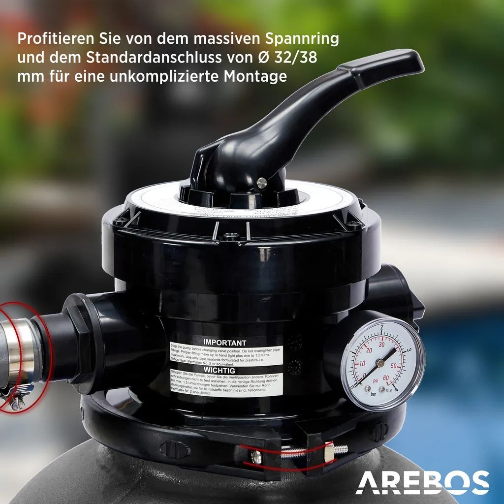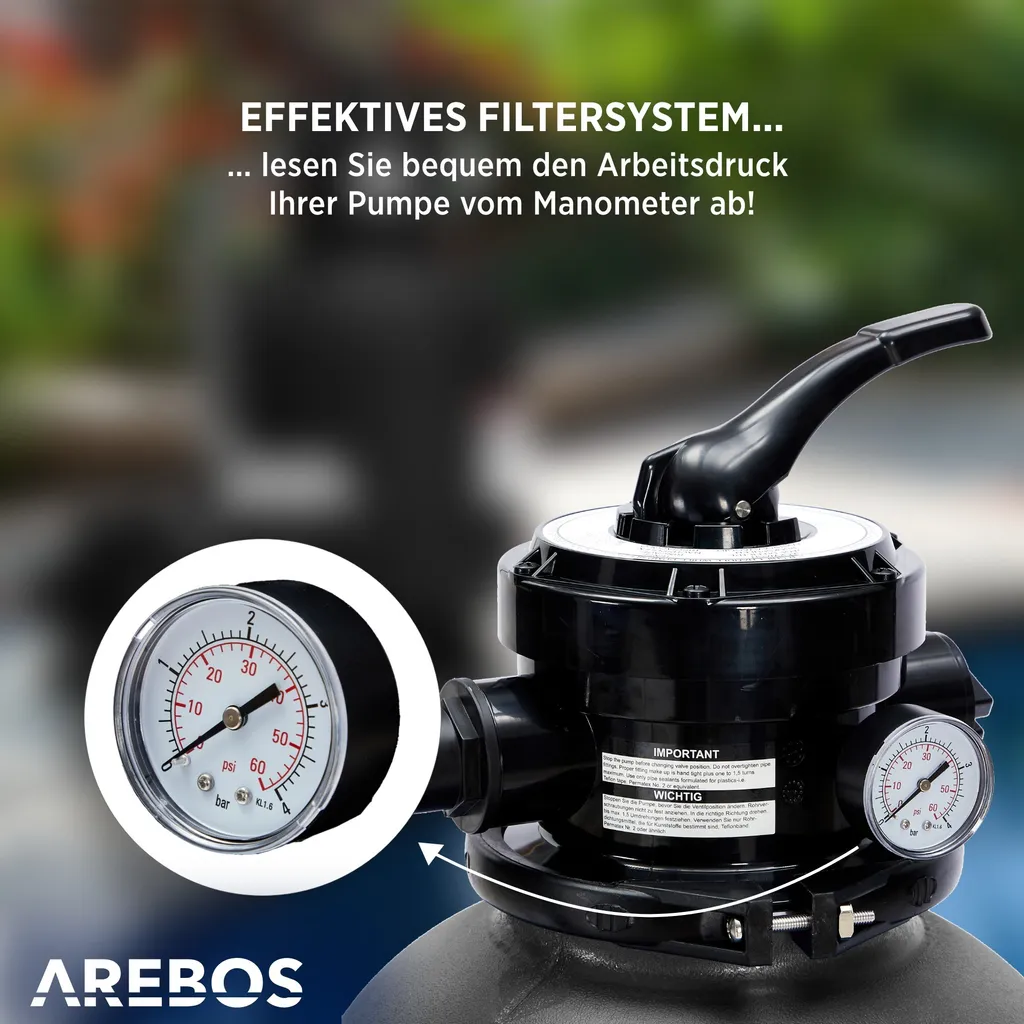 AREBOS Sandfilteranlage Mit Pumpe | 400W | 10.200 L/h | Tankvolumen Bis Zu 20 Kg Sand | 7 – Wege Ventil Mit Griff | Mit Druckmanometer | Inkl. 1400g Filterbälle | Inkl. 2m Schlauch | Grau