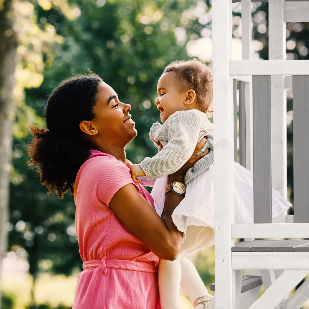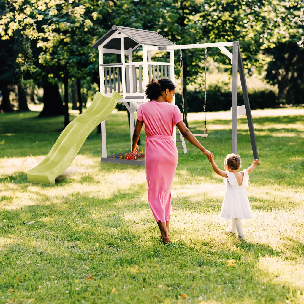 AXI Beach Tower Spielturm Aus Holz In Weiß & Grau | Spielhaus Für Kinder Mit Hellgrüner Rutsche, Schaukel Und Sandkasten | Stelzenhaus Für Den Garten