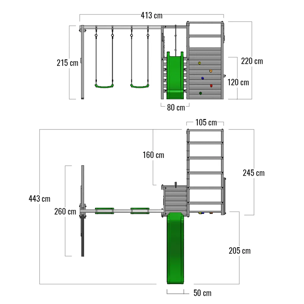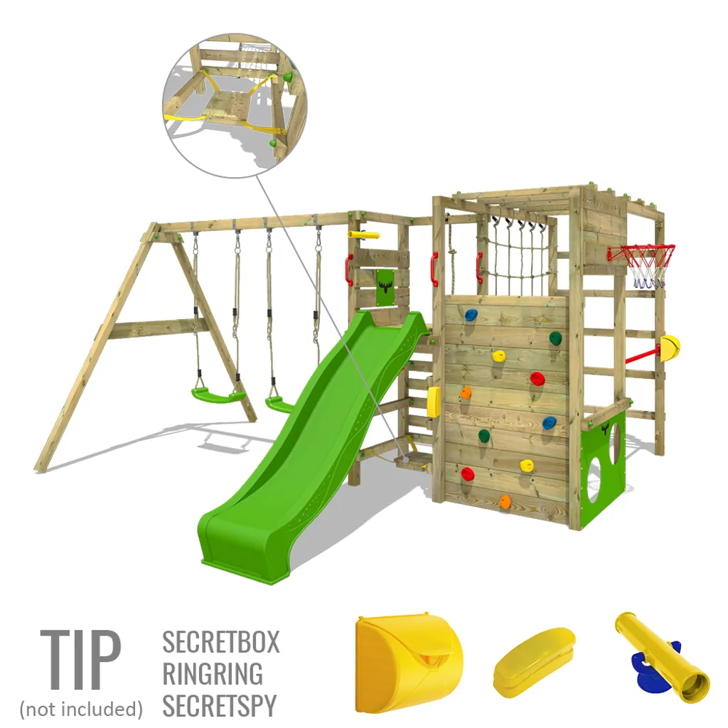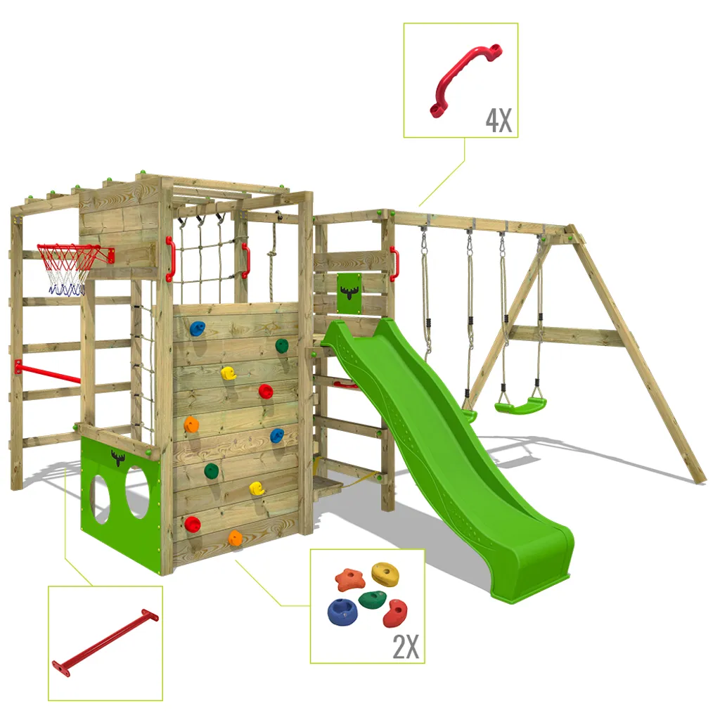 FATMOOSE Klettergerüst Spielturm ActionArena Mit Schaukel & Rutsche, Gartenspielgerät Mit Leiter & Spiel-Zubehör – Apfelgrün