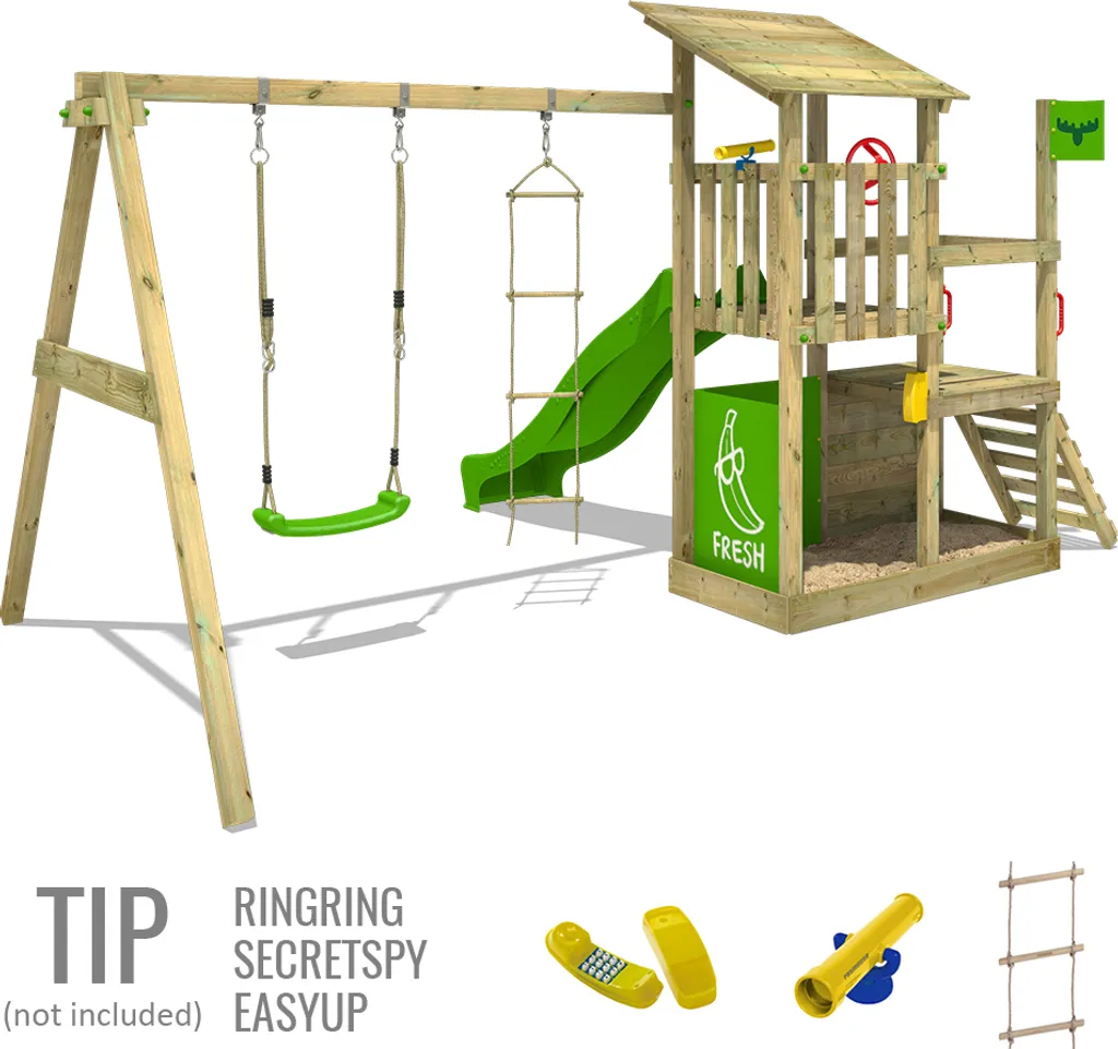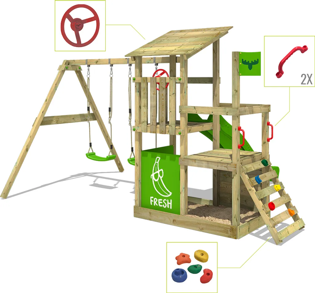 FATMOOSE Spielturm Klettergerüst FruityForest Mit Schaukel & Rutsche, Kletterturm Mit Sandkasten, Leiter & Spiel-Zubehör – Rot