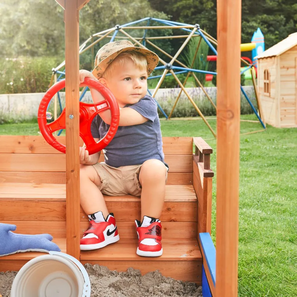HOME DELUXE – Sandkasten MATSCHEKISTE – 160 X 78 X 103 Cm – , Piratenschiff, Sandkiste Mit Sonnendach, Aufklappbare Sitzbank, Spielzeug