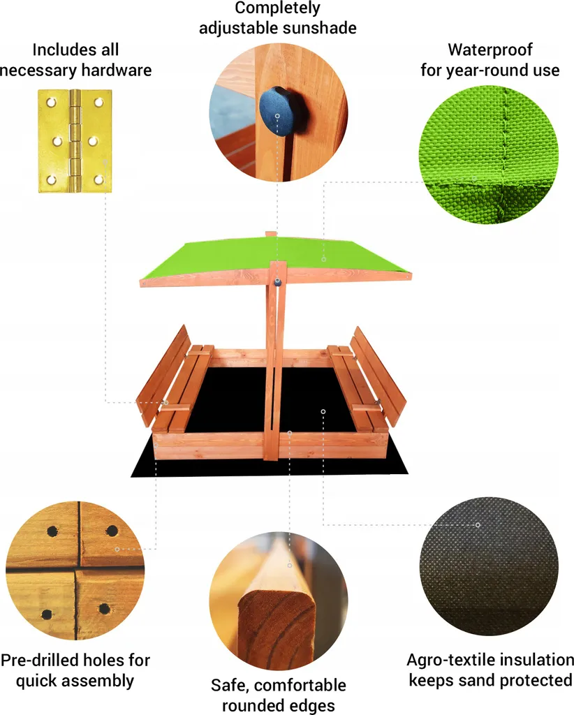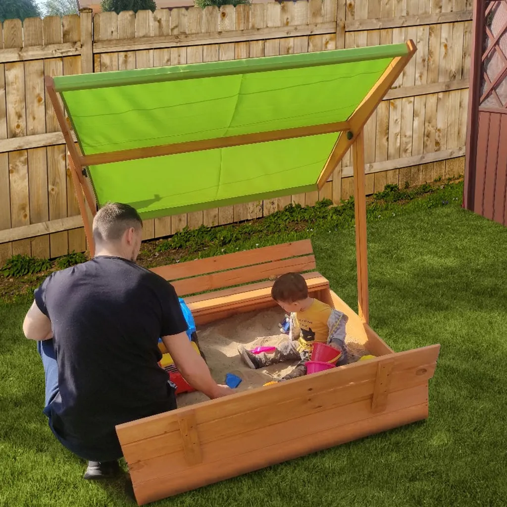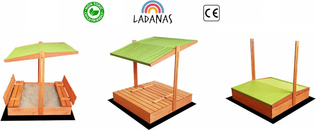 Ladanas® Sandkasten Holz- 140 X 140- Mit Faltbaren Bänken XXL& Verstellbarem Dach- UV50- Sandkiste Kinder & Imprägniert & Sonnendach (grün)