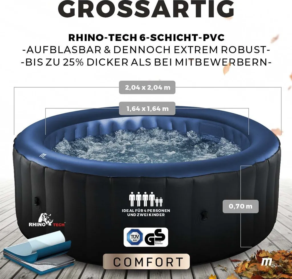 MSpa Whirlpool Bergen – Aufblasbar – Für 6 Personen – UV-C Filter – 138 Luftdüsen – Anti-Frost-System Winterfest – Rhino-Tech 6-Schicht-PVC – All-in-One LED Fernbedienung – Plug-&-Play-Aufbau – 1500 Watt PTC-Heiztechnologie Mit 40°C Schnellheizsystem – Verschließbare Poolabdeckung – Outdoor & Indoor – Rund – Garten – Pool (Anthrazit/Blau)