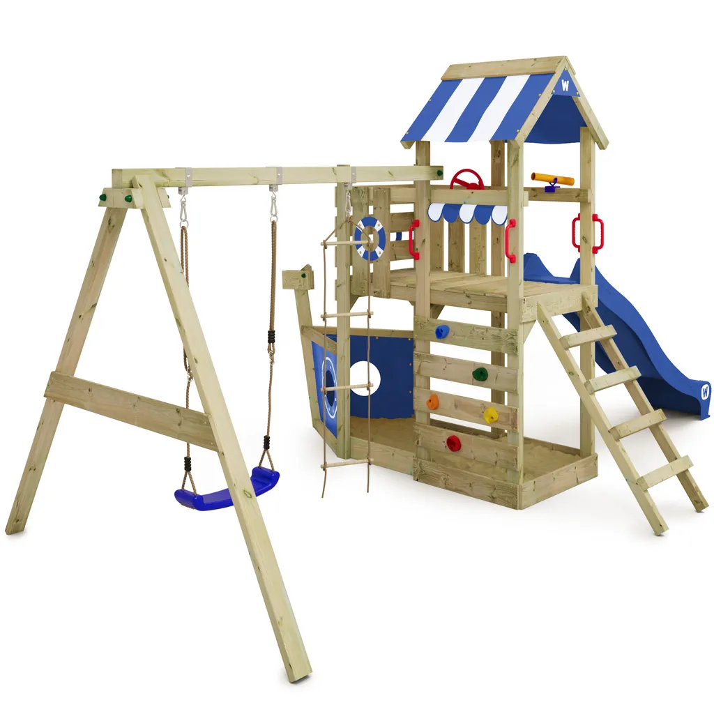 WICKEY Spielturm Klettergerüst SeaFlyer Mit Schaukel & Rutsche, Baumhaus Mit Sandkasten, Kletterleiter & Spiel-Zubehör – Blau
