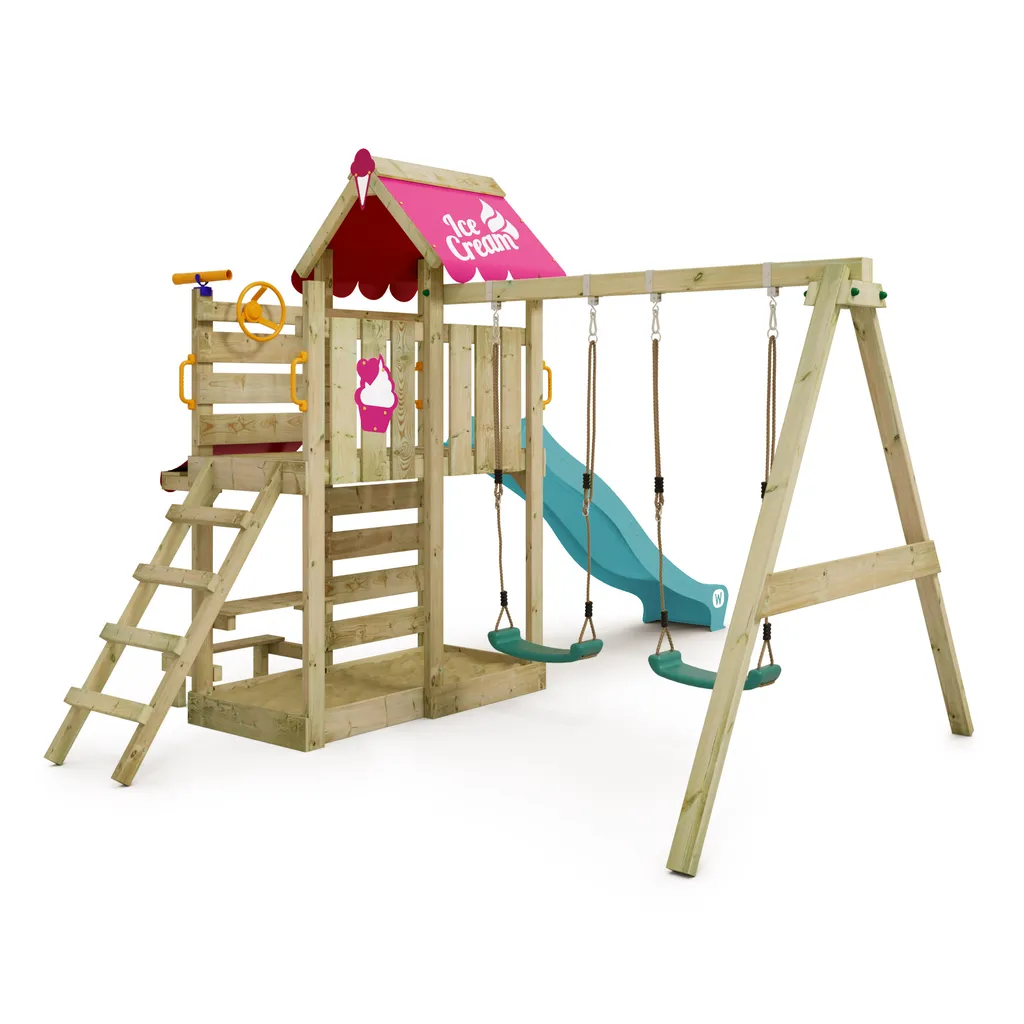 WICKEY Spielturm Klettergerüst VanillaFlyer Mit Schaukel & Rutsche, Kletterturm Mit Sandkasten, Leiter & Spiel-Zubehör – Türkis